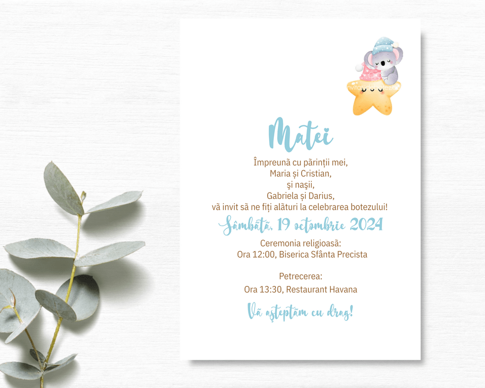 Invitatii de botez minimaliste cu ursulet Koala, pentru baietel. Invitatiile de botez sunt realizate din carton alb neted, print cu ursulet Koala dormin pe o steluta, cu text simplu ce poate fi personalizat, accesorizate cu un plic colorat. Invitatia de botez cu ursulet Koala se poate realiza si numai in format digital (tip imagine).