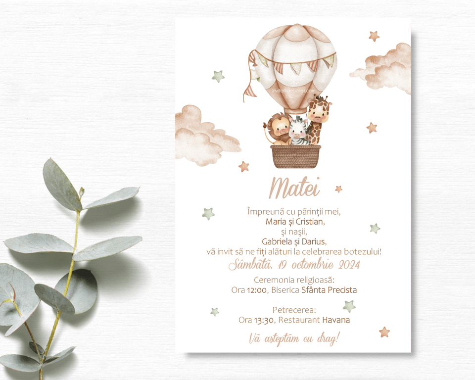 Invitatii de botez minimaliste cu balon cu aer cald in culori neutre, pentru baietel. Invitatiile de botez sunt realizate din carton alb neted, print cu animalute, tematica safari, si balon cu aer cald in nuante neutre, cu text simplu ce poate fi personalizat, accesorizate cu un plic colorat premium. Invitatia de botez cu balon aer cald se poate realiza si numai in format digital (tip imagine).