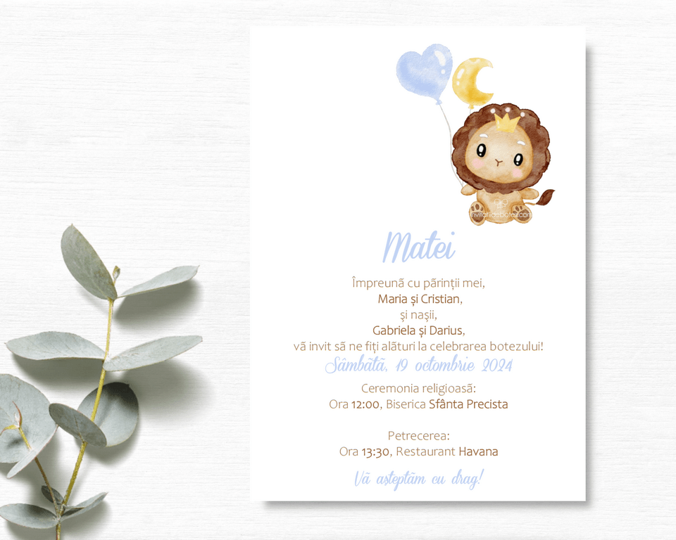Invitatii de botez minimaliste cu leu si baloane colorate, pentru baietel. Invitatiile de botez sunt realizate din carton alb neted, print cu leu cu coronita si baloane, cu text simplu ce poate fi personalizat, accesorizate cu un plic colorat premium. Invitatia de botez cu leu se poate realiza si numai in format digital (tip imagine).