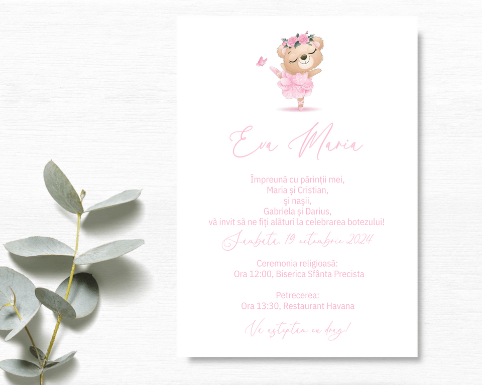 Invitatii de botez minimaliste cu balerina ursulet, pentru fetita. Invitatiile de botez sunt realizate din carton alb neted, print cu balerina ursulet, cu text simplu ce poate fi personalizat, accesorizate cu un plic colorat. Invitatia de botez cu balerina se poate realiza si numai in format digital (tip imagine).