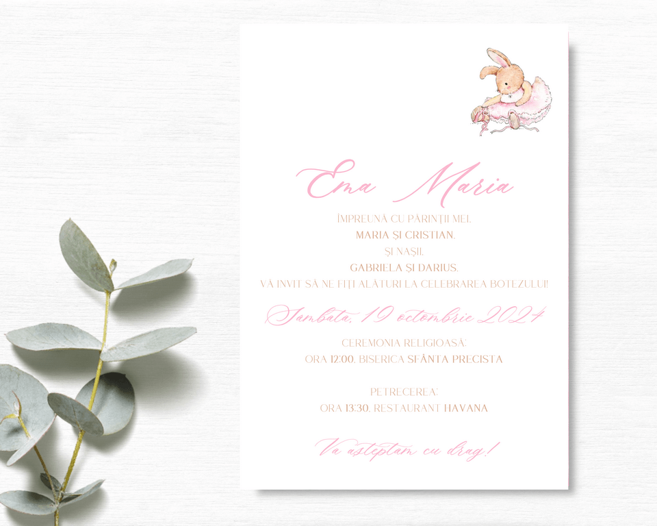 Invitatii de botez minimaliste cu balerina iepuras, pentru fetita. Invitatiile de botez sunt realizate din carton alb neted, print cu balerina, cu text simplu ce poate fi personalizat, accesorizate cu un plic colorat. Invitatia de botez cu balerina iepuras se poate realiza si numai in format digital (tip imagine).