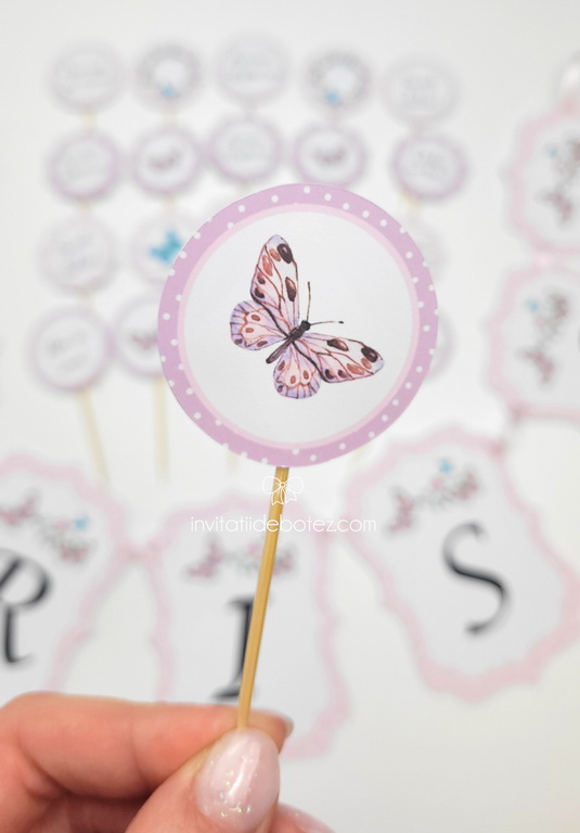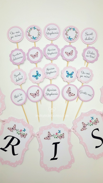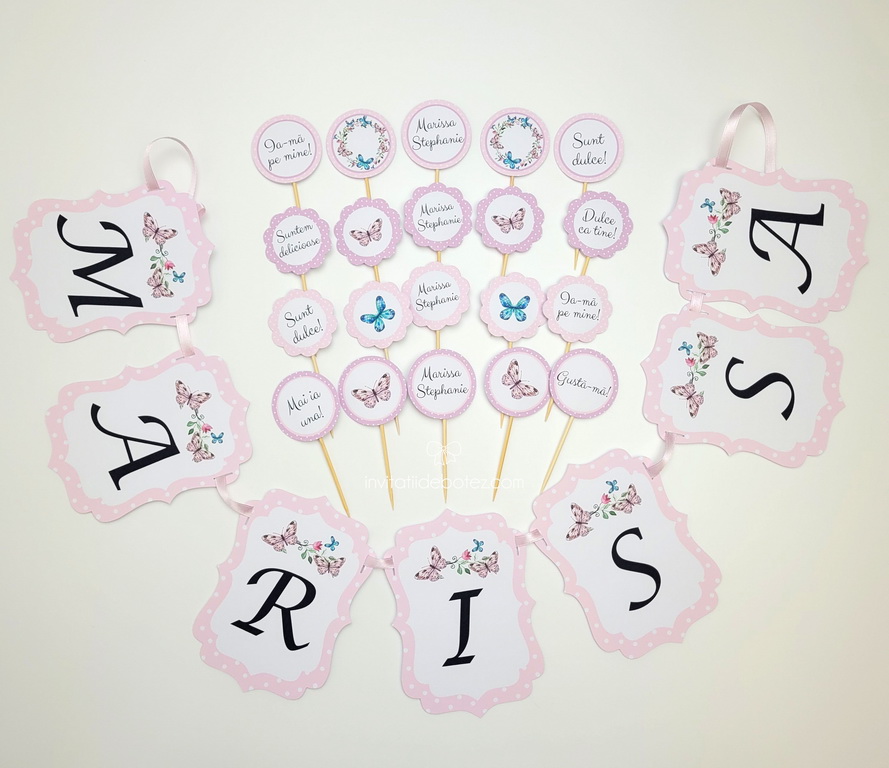 Litere pentru ghirlanda cu numele copilului cu fluturasi. Literele pentru ghirlanda sunt realizate din cartonane decupate si sunt insirate pe panglica asortata. Ghirlanda poate fi folosita la decorarea camerei copilului sau la botez, pentru candy bar. Mesaje candy bar/propsuri pentru candy bar in culori pastelate, cu numele fetitei si fluturi. Mesajele pentru prajituri sunt realizate din doua cartonase lipite si un betitsor si pot fi personalizate.