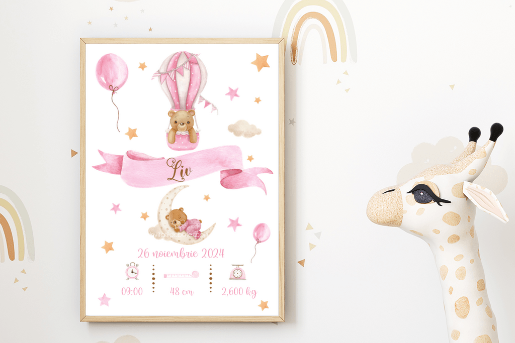Tablou personalizat cu datele importante din prima zi de viata a bebelusului (nume, data nasterii, greutate etc), care sa va aminteasca mereu de frumoasa zi in care a venit pe lume minunea voastra.