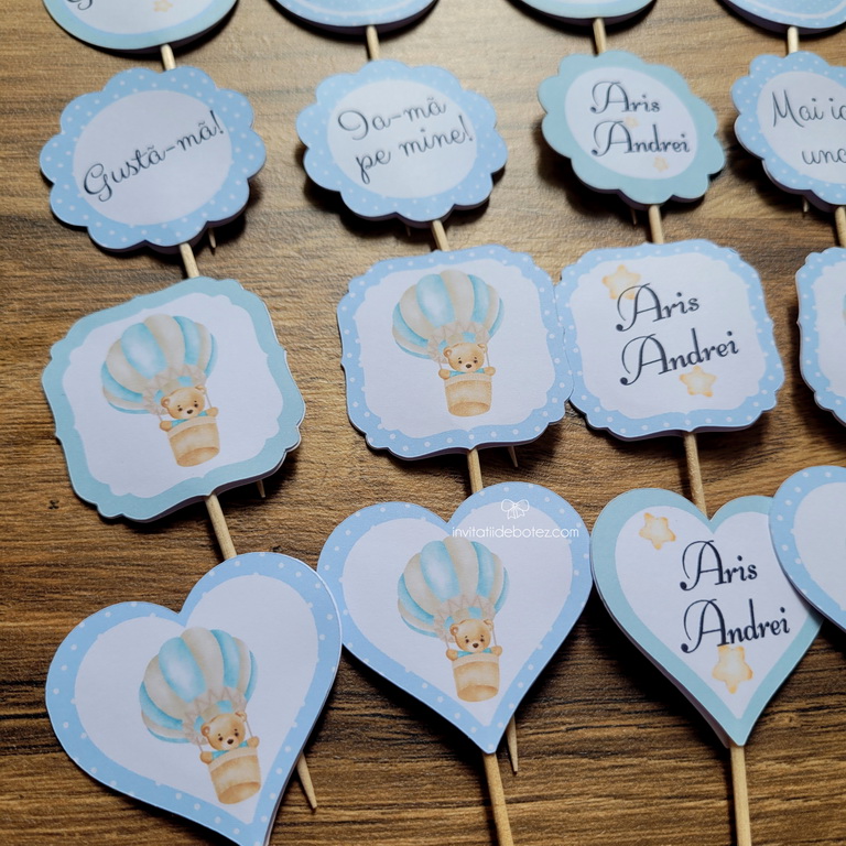 Mesaje/propsuri mici pentru candy bar si litere ghirlanda pentru botez tematic cu ursulet in balon cu aer cald