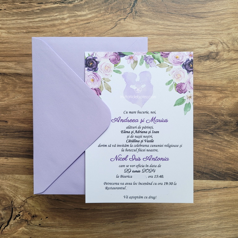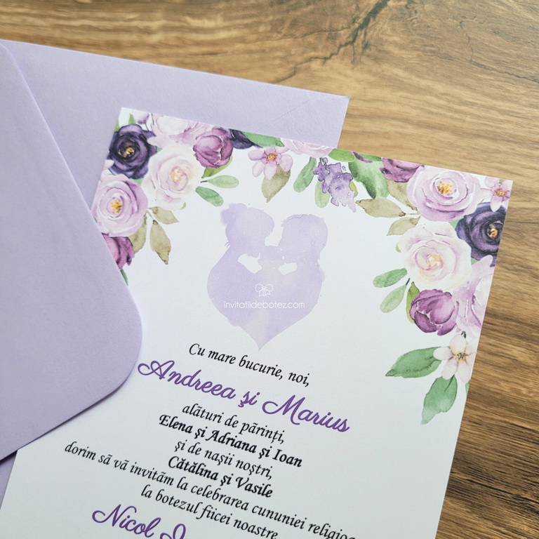 Invitatii de nunta si botez 2 in 1, cu miri si bebelus, flori mov-lila