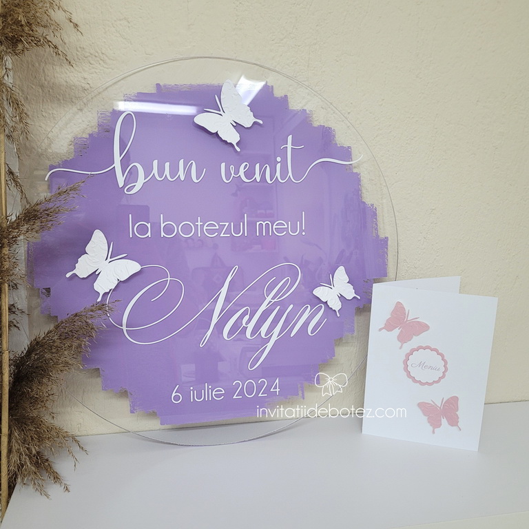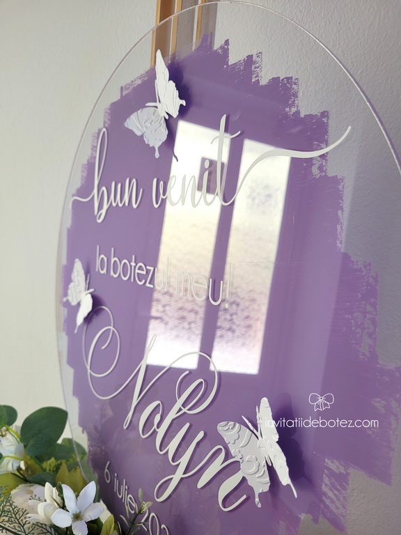 Panou de intampinare a invitatilor pentru nunta sau botez, realizat din plexiglas transparent, personalizat cu text din autocolant alb si vopsit lila, cu fluturasi din carton alb decupati si embosati.