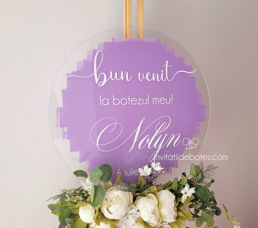 Panou de intampinare a invitatilor pentru nunta sau botez, realizat din plexiglas transparent, personalizat cu text din autocolant alb si vopsit lila.