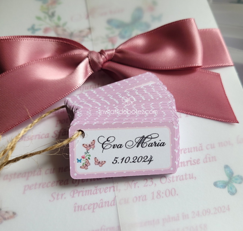 Etichete pentru marturii de botez cu fluturasi in nuante pastelate de roz si mov. Etichetele pentru marturii sunt realizate din carton alb neted si pot fi cu gaurica sau autocolante, de lipit. Dimensiunea si grafica se pot personaliza.