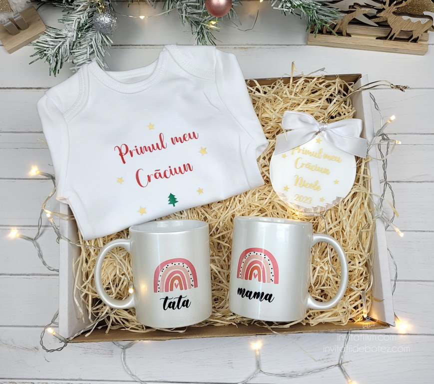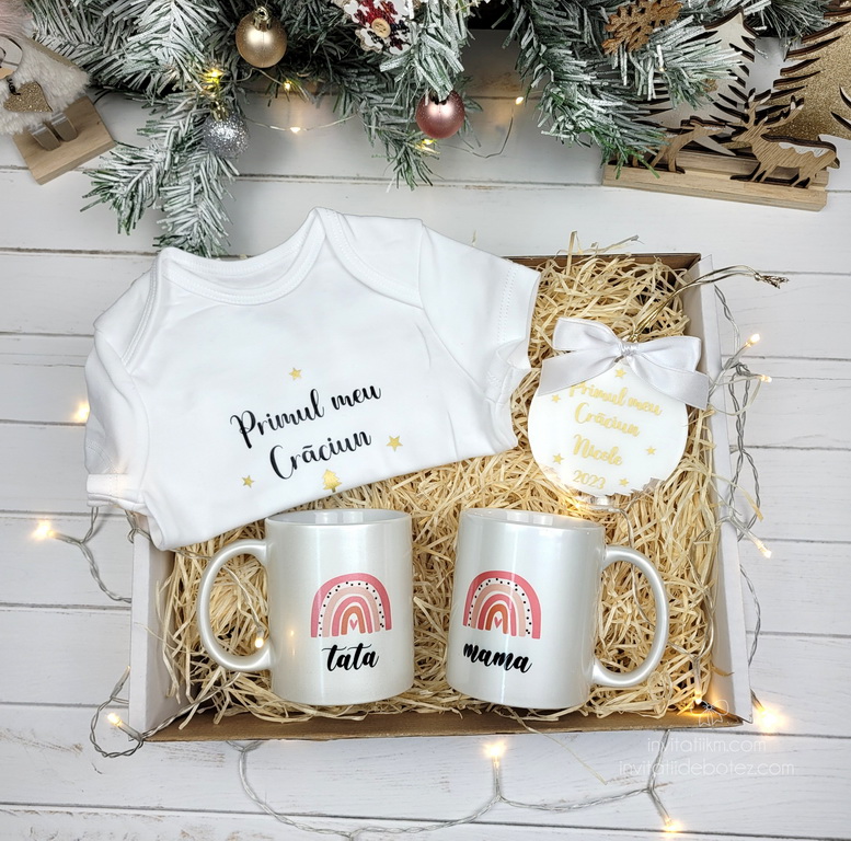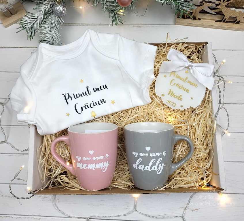 Set cadou pentru nou-nascut si tineri parinti, perfect pentru a sarbatori venirea pe lume a noului membru al familiei. Il veti primi ambalat in cutie + fundita asortata, gata de a-l oferi cadou si il putem expedia oriunde doriti, trebuie doar sa ne lasati adresa celui care il va primi. Textele se pot personaliza dupa preferinte.