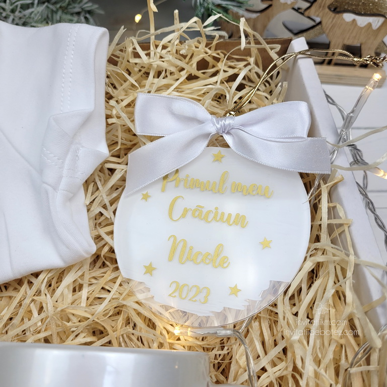 - un ornament de Craciun din plexiglas, fundita satinata si textul dorit, personalizat cu vinil auriu
