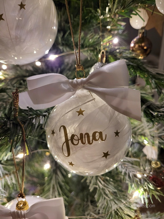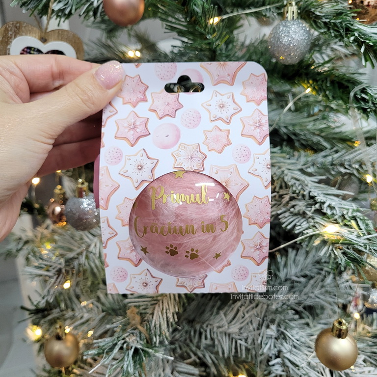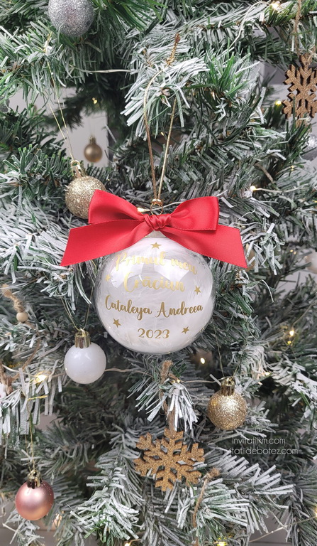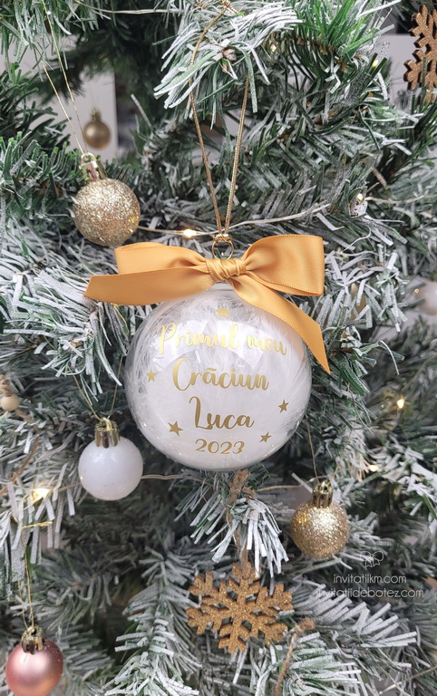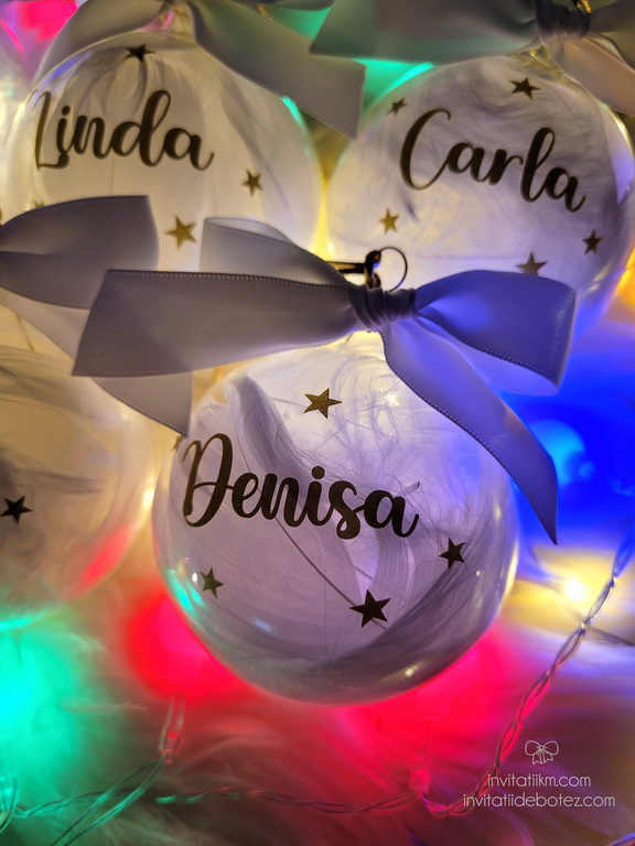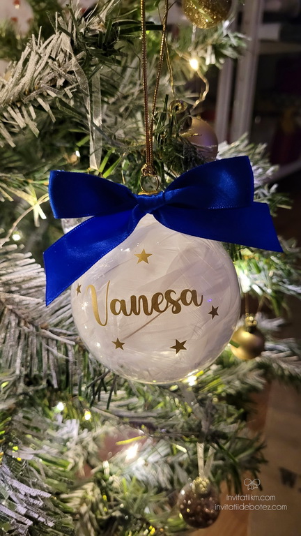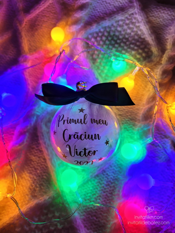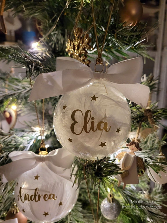 Textul este realizat din autocolant auriu, decupat si aplicat cu grija pe globul din sticla. Globurile sunt din sticla, rotunde, cu diametru de 8 cm, umplute cu puf alb sau colorat si vor fi livrate in ambalaj individual. Funditele sunt realizate din panglica satinata, atent lucrate, astfel incat capetele nu se desira. Fiind lucrate manual, pot exista mici diferente intre produse.