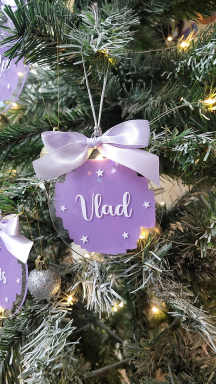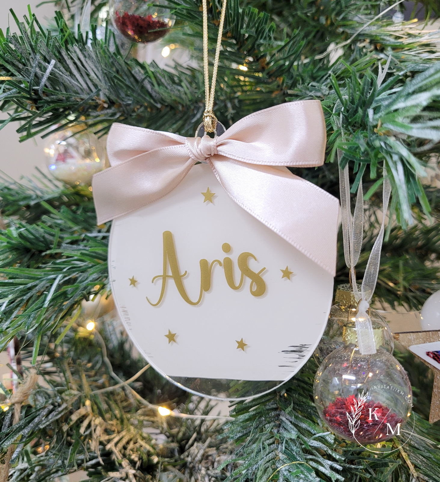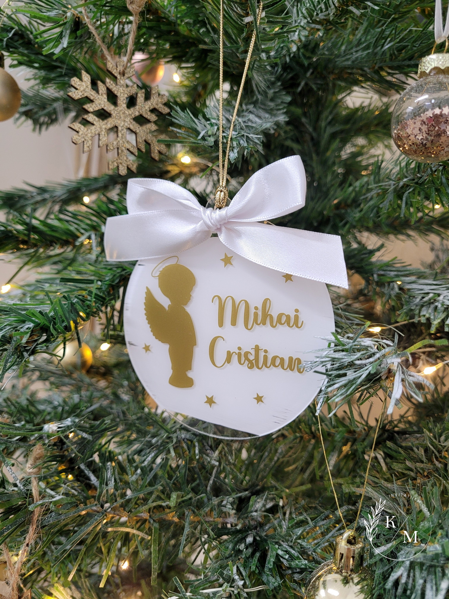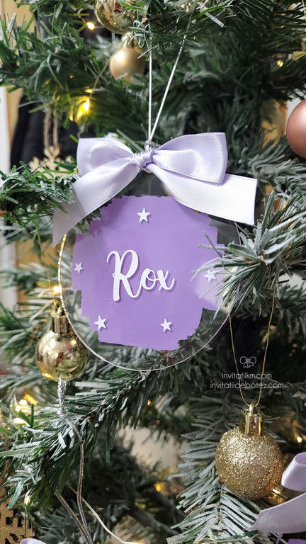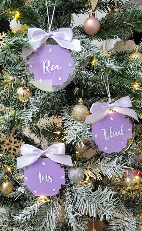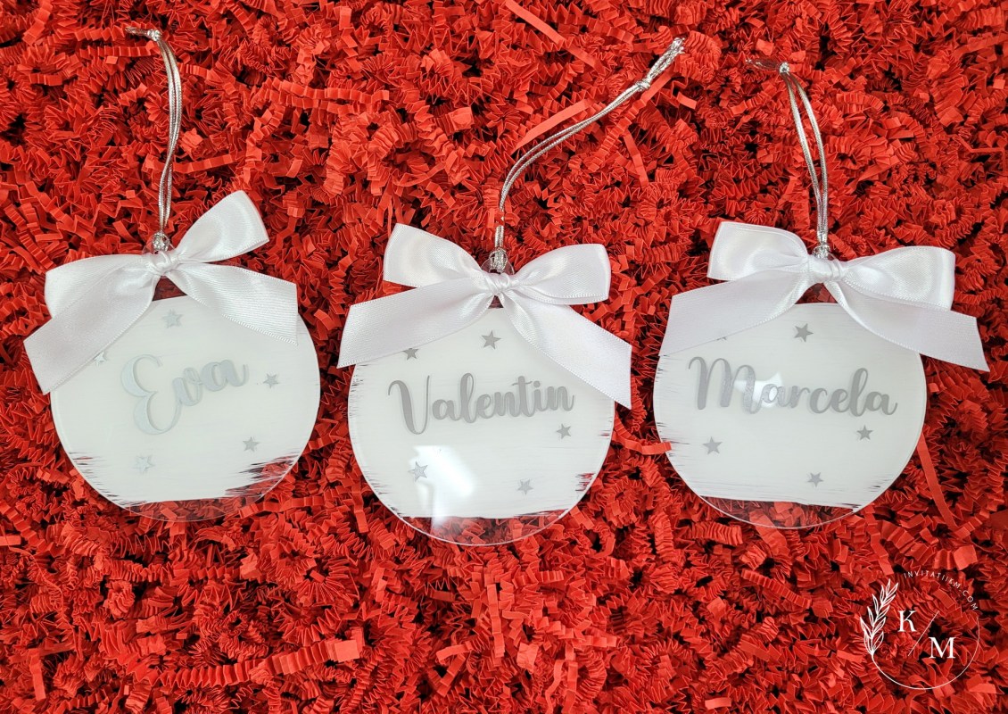 Globuri de Craciun/ornamente personalizate cu nume parinti/copii etc. sau cu diverse texte (Craciun fericit, Craciun magic, Primul Craciun impreuna, Primul Craciun in 2/3/4 etc).