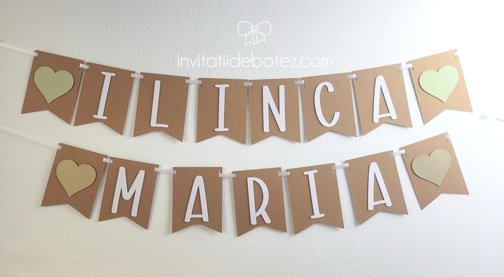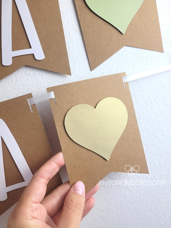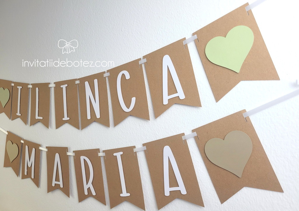 Ghirlanda cu nume/banner personalizat cu nume pentru botez, aniversare sau camera copilului. Culorile inimioarelor se pot modifica (in imagini: verde olive si auriu)