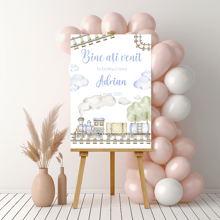 Panou “bine ati venit la botezul meu” cu tematica trebulet, pentru baietel. La plasarea comenzii, va rugam sa specificati daca doriti format digital sau printat.