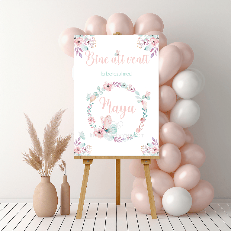 Panou de intampinare invitati “Bine ati venit la botezul meu” pentru fetite, cu coronita florala in nuante pastelate si fluturasi. La plasarea comenzii, va rugam sa specificati daca doriti format digital sau printat.
