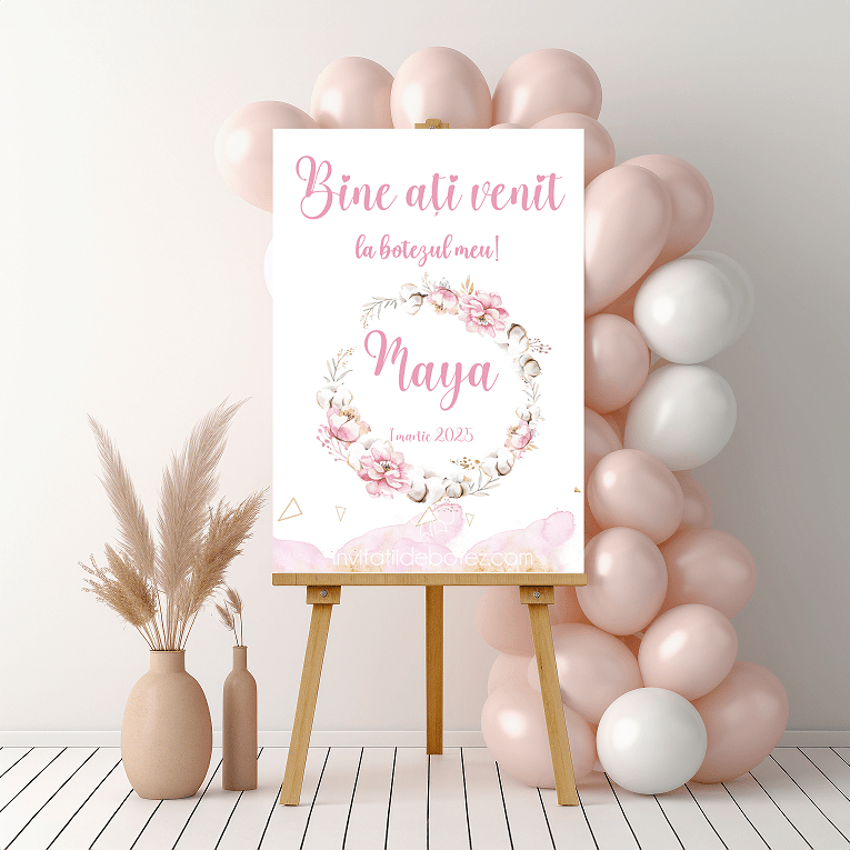 Panou de intampinare invitati “Bine ati venit la botezul meu” pentru fetite, cu coronita florala in nuante pastelate si flori de bumbac. La plasarea comenzii, va rugam sa specificati daca doriti format digital sau printat.