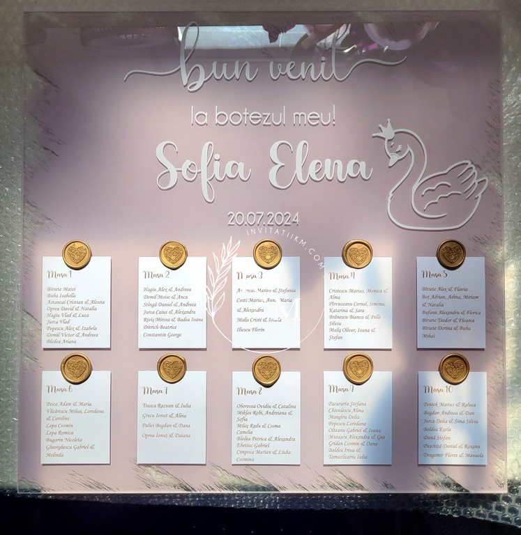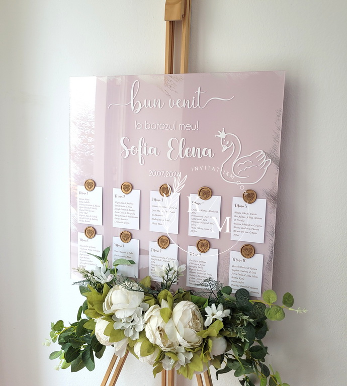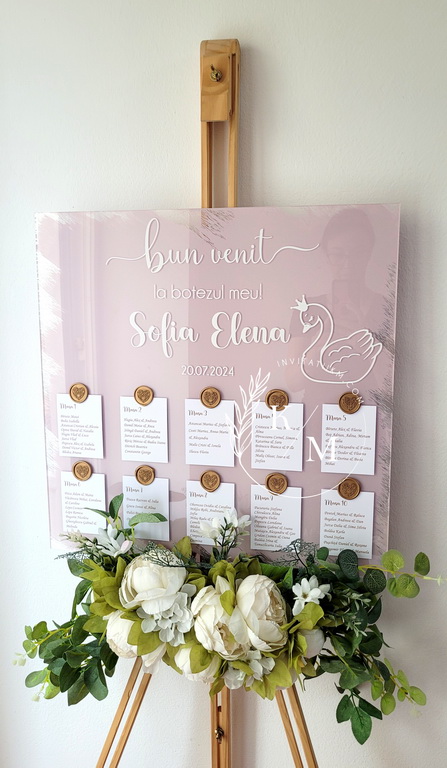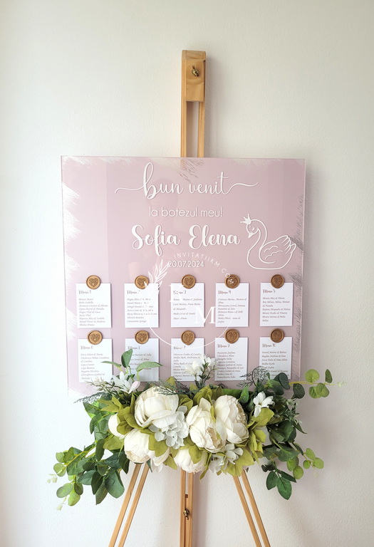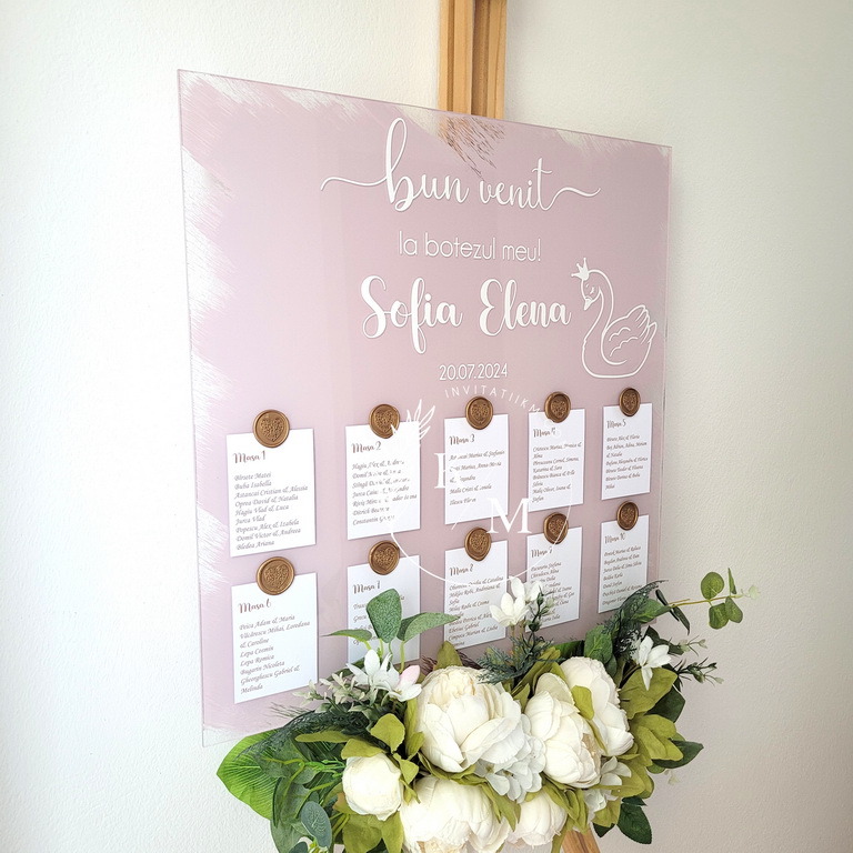 Panou de intampinare pentru botez si cartonase cu asezarea invitatilor la mese. Panoul este realizat din plexiglas transparent vopsit roz antic/roz vintage pe verso, are dimensiunea 50 x 50 cm, iar cartonasele sunt realizate din carton alb neted + sigiliu. In functie de numarul cartonaselor, acestea pot fi mai mari/mai micute. Se pot achizitiona impreuna sau separat.