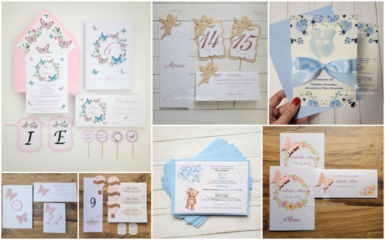 - Invitații de botez personalizate cu numele copilului, data și tematica evenimentului
