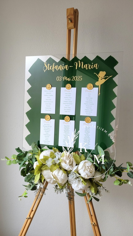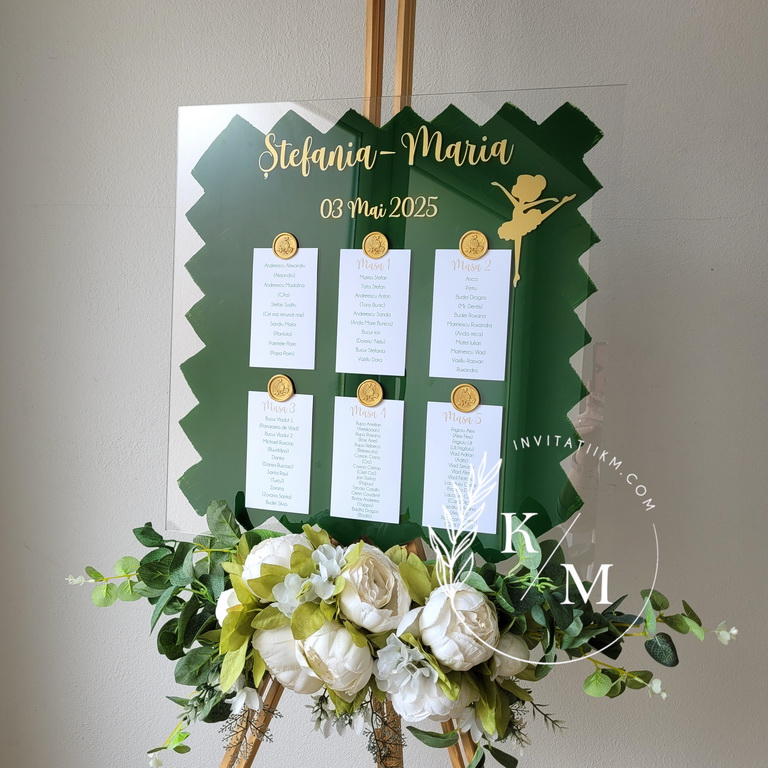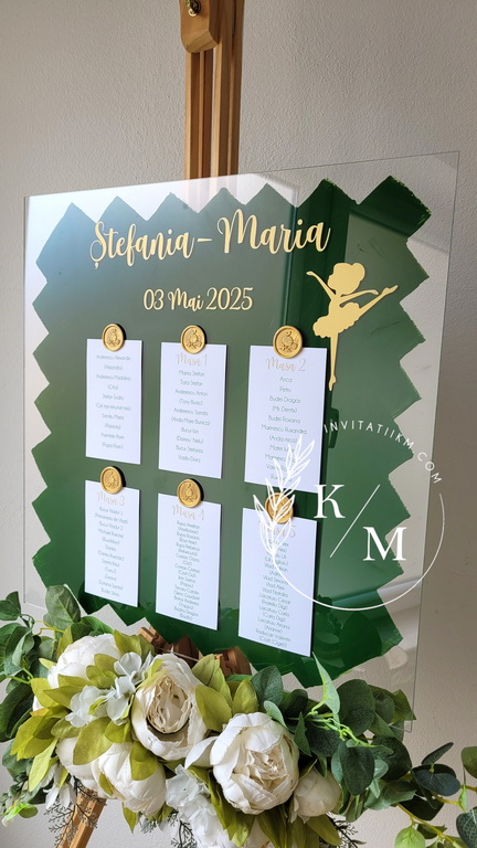 Panou de intampinare pentru botez si cartonase cu asezarea invitatilor la mese. Panoul este realizat din plexiglas transparent vopsit pe verso, are dimensiunea 50 x 50 cm, iar cartonasele sunt realizate din carton + sigiliu. In functie de numarul cartonaselor, acestea pot fi mai mari/mai micute. Se pot achizitiona impreuna sau separat.
