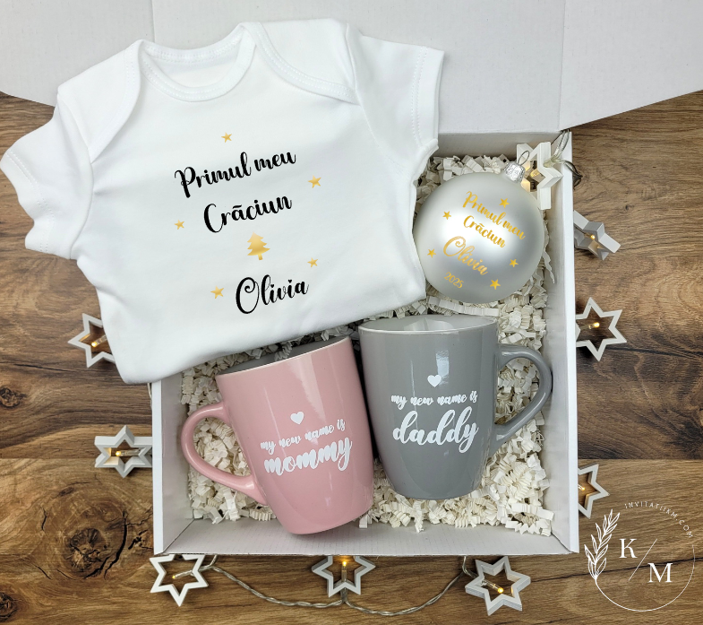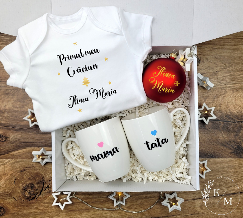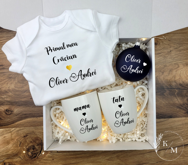 Cutia conține produse utile și simbolice: un body moale din bumbac personalizat cu numele bebelușului, două căni pentru părinți, un glob delicat din sticlă și o cutie decorată manual, completată cu fundiță și umplutură decorativă. Globurile și cănile sunt ambalate și în folie cu bule, pentru extra protecție.