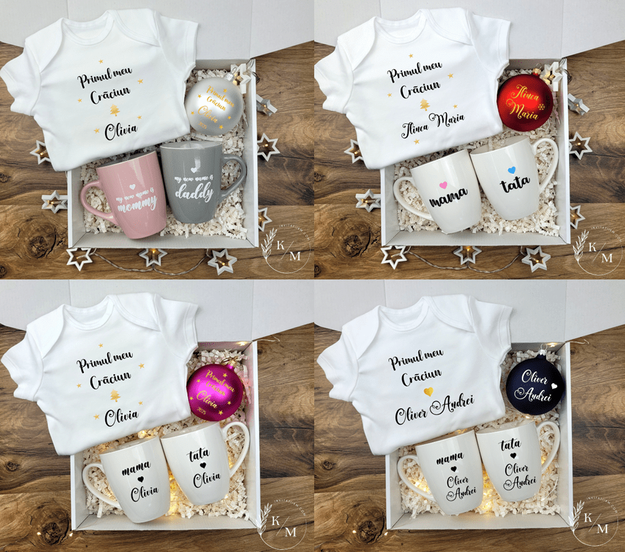 Fiecare element este atent personalizat și ambalat, gata să fie oferit ca un dar prețios pentru părinți.