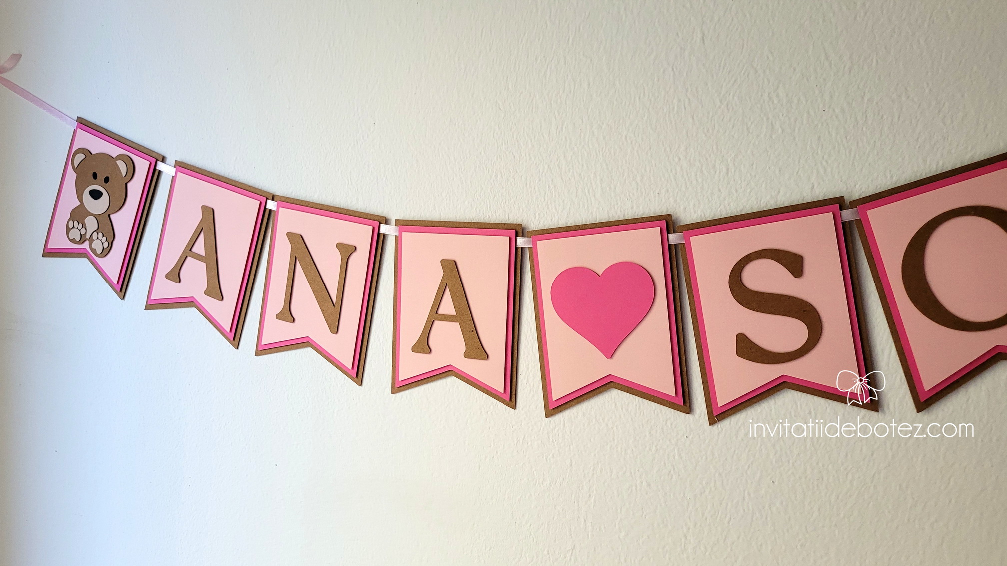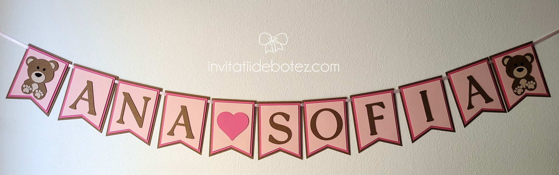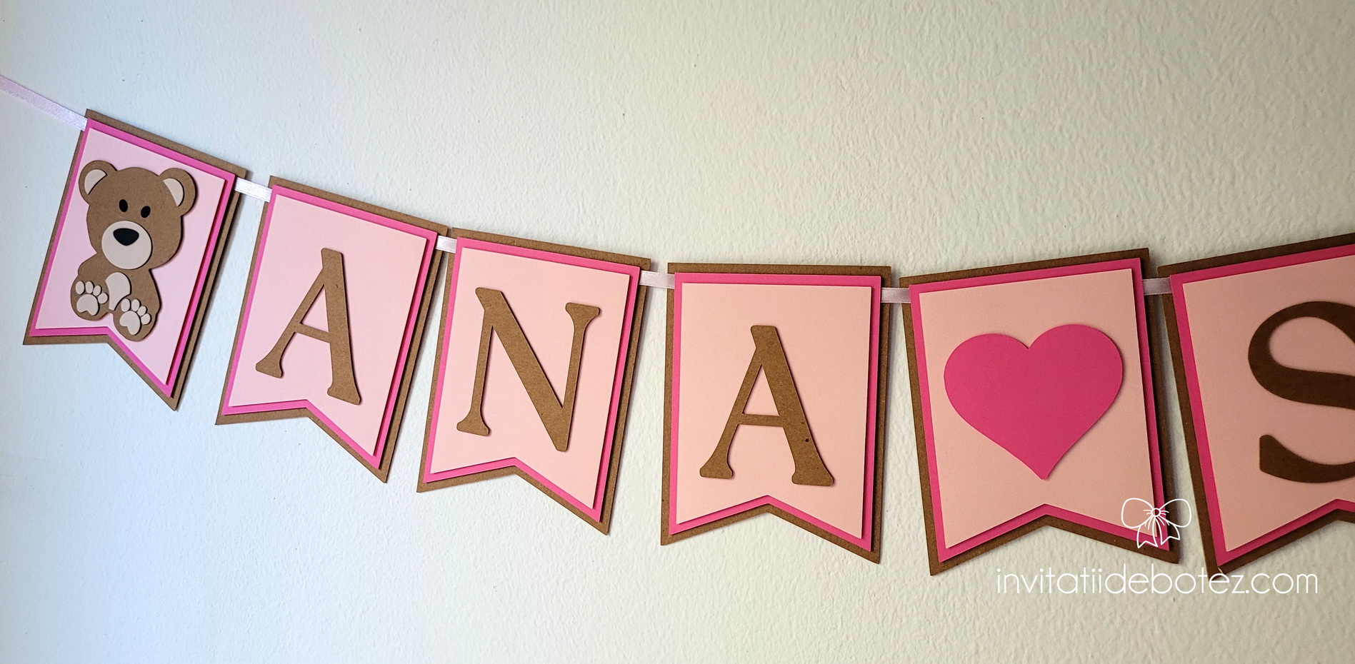 Litere pentru ghirlanda cu ursulet decupat si inimioara realizate din mai multe cartonase colorate suprapuse. Pot fi folosite la decorarea camerei copilului sau la botez, pentru coltul cu dulciuri/candy bar. Culorile se pot schimba, la fel si formele.